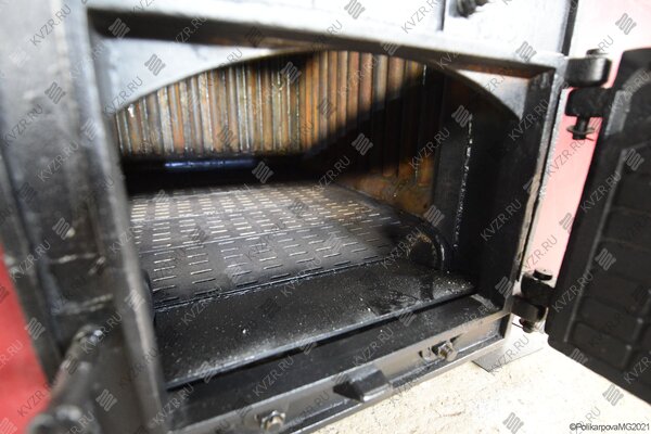 Также она оборудуется двумя топочными дверцами, расположенными одна над другой, двумя зольными коробами и специальной дверцей для уборки золы. Процесс горения происходит на колосниковой решетке, зола проваливается в короб через специальные отверстия. Эффективное сгорание твердого топлива обеспечивается не только большими размерами топки, но и наличием поворотной камеры и газоплотных панелей.