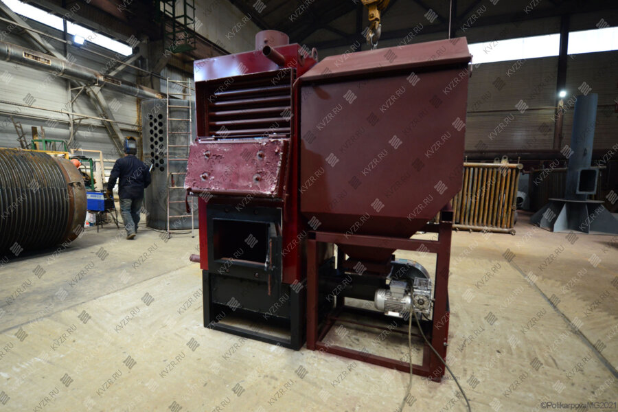 Пеллетный котел автоматический с ретортной горелкой состоит из опорной рамы, теплообменника, расходного бункера, ретортной горелки, дутьевого вентилятора, емкости-накопителя.
