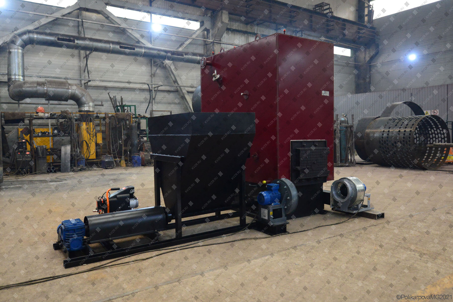 Бункер и привод питателя располагаются на общей раме. Конструкция бункера и узел соединения со шнековым питателем позволяет полностью опорожнять бункер за счет питателя топлива.